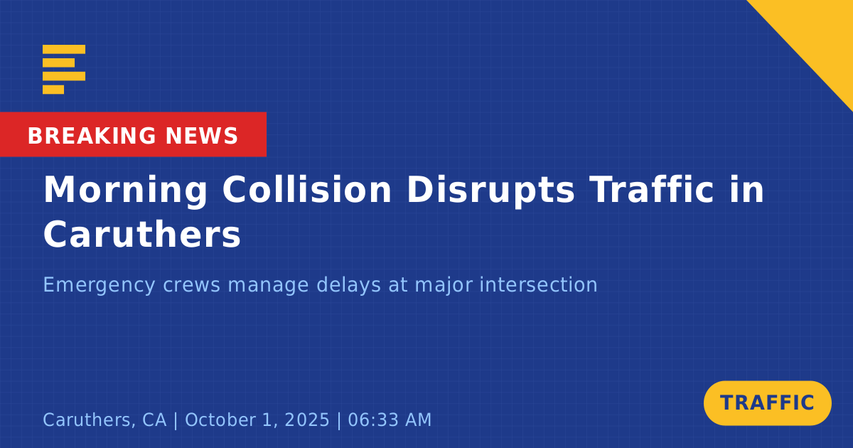 A traffic collision occurred this morning at the intersection of South West Avenue and West Elkhorn Avenue in Caruthers, CA. At approximately 6:33 AM, a vehicle collided with a power pole, prompting a swift response from emergency and traffic management units. The power pole remained upright after the incident.