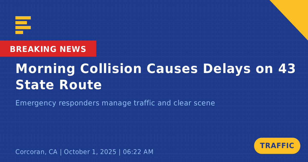 A traffic collision involving two vehicles occurred today on State Route 43 (SR 43) at Santa Fe Avenue in Corcoran, CA. The incident took place around 6:22 AM during the morning commute, involving a black Honda and a gray GMC SRA. The collision led to a coordinated emergency response, with multiple traffic management units dispatched to the scene to manage the situation.