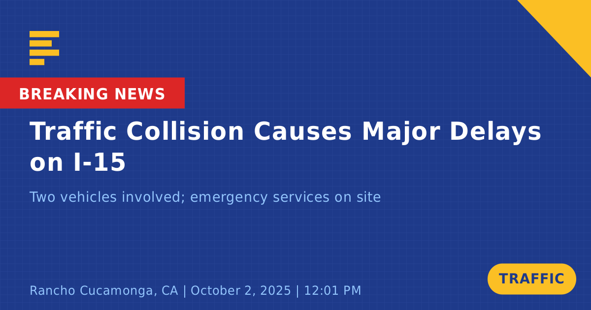 A traffic collision on Interstate 15 South near Foothill Boulevard in Rancho Cucamonga, CA, caused significant traffic disruptions today around noon. The incident involved two vehicles: a blue Honda SUV and an unidentified vehicle. The collision was triggered by a tire blowout, which resulted in the Honda SUV being moved to the right-hand side of the highway.