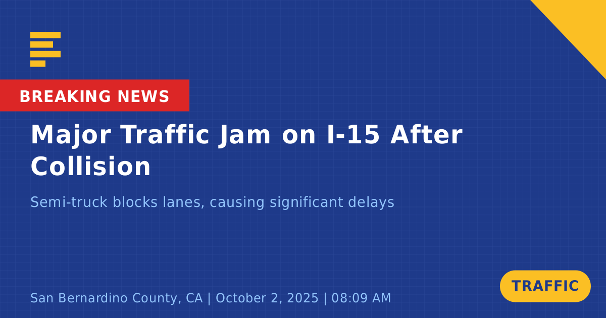 A significant traffic collision occurred today on Interstate 15 South near the Nipton Road Off-Ramp in San Bernardino County, CA, causing considerable delays during the morning commute. The incident involved two vehicles: a green semi-truck with an ABF trailer and an SUV. The semi-truck was blocking the roadway, leading to substantial traffic congestion and backups for drivers.