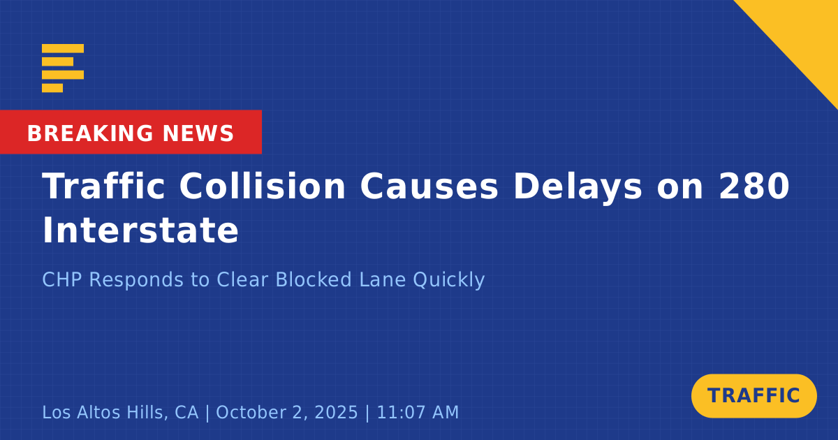 A traffic collision on Interstate 280 South in Los Altos Hills, CA, caused notable traffic disruptions today. The incident occurred around 11:07 AM and involved two vehicles: a grey Nissan and a blue and brown Ford van. Both vehicles remained drivable after the crash, but the right-hand lane was blocked, leading to traffic delays.