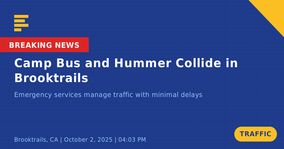 A traffic collision involving two vehicles, a camp bus and a Hummer, occurred today in Brooktrails, CA, at approximately 4:03 PM. The incident took place on the roadway near the 2550 Mm20 E Men 25.50 marker. Fortunately, the roadway remained open during the incident, resulting in minimal traffic impact and no significant delays for drivers.