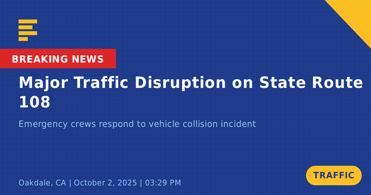 A traffic collision on State Route 108 (SR-108) in Oakdale, CA, caused significant disruptions this afternoon. The incident, which occurred around 3:30 PM, involved two vehicles: a black sedan that left the roadway and a black Toyota that crashed through a fence and began emitting engine smoke.