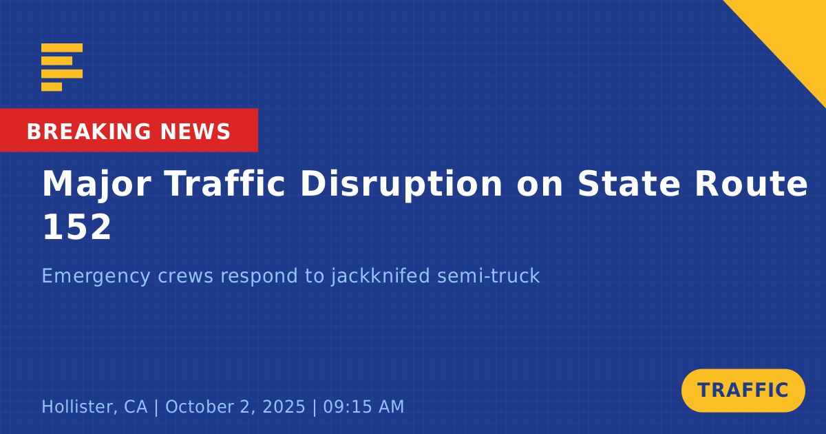 A traffic collision on State Route 152 in Hollister, CA, caused significant disruptions during the morning commute today. The incident involved two vehicles: a green colored semi-truck with a flatbed trailer and a solo vehicle. The collision occurred around 9:17 AM when the tractor-trailer jackknifed and slid off the road onto a hillside.