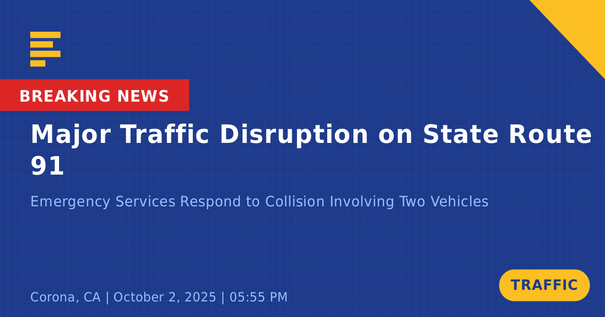 A traffic collision on State Route 91 East at Interstate 15 in Corona, CA, caused significant traffic disruptions today. The incident, involving two vehicles—a gray Ford Fiesta and a black GMC truck—occurred around 5:57 PM. Emergency services promptly responded to the scene, implementing traffic control measures to manage the situation.