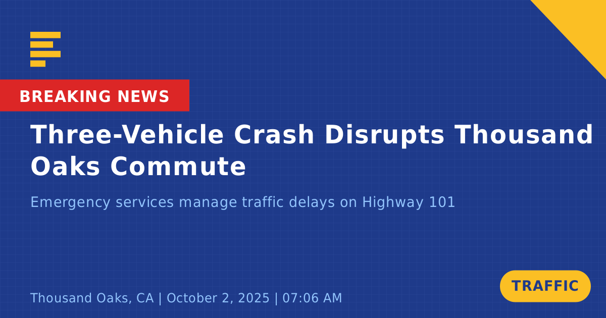 A traffic collision on US Highway 101 South in Thousand Oaks, CA, caused significant disruptions during the morning commute today. The incident, which involved three vehicles, including a white Kia SUV, occurred around 7:07 AM near the junction with Moorpark Road.