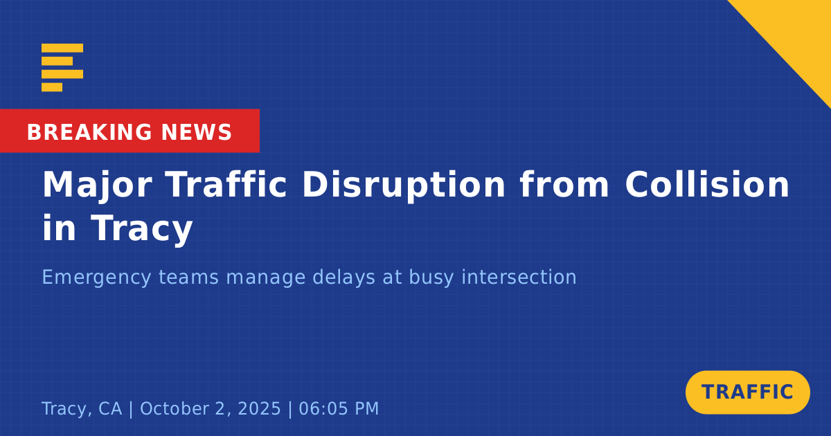 A traffic collision occurred today at the intersection of W Grant Line Road and Midway Road in Tracy, CA, involving two vehicles: a white pickup truck and a black Honda SUV. The incident took place around 6:06 PM, resulting in significant traffic disruptions as the westbound lane was completely blocked.