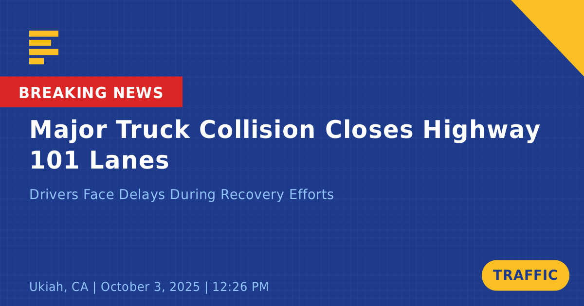 A significant traffic collision occurred today on the eastbound side of Highway 101 near mile marker 253 in Ukiah, CA, involving a large truck with a container on its flatbed. The incident was reported at approximately 12:26 PM, prompting an immediate emergency response to manage the situation.