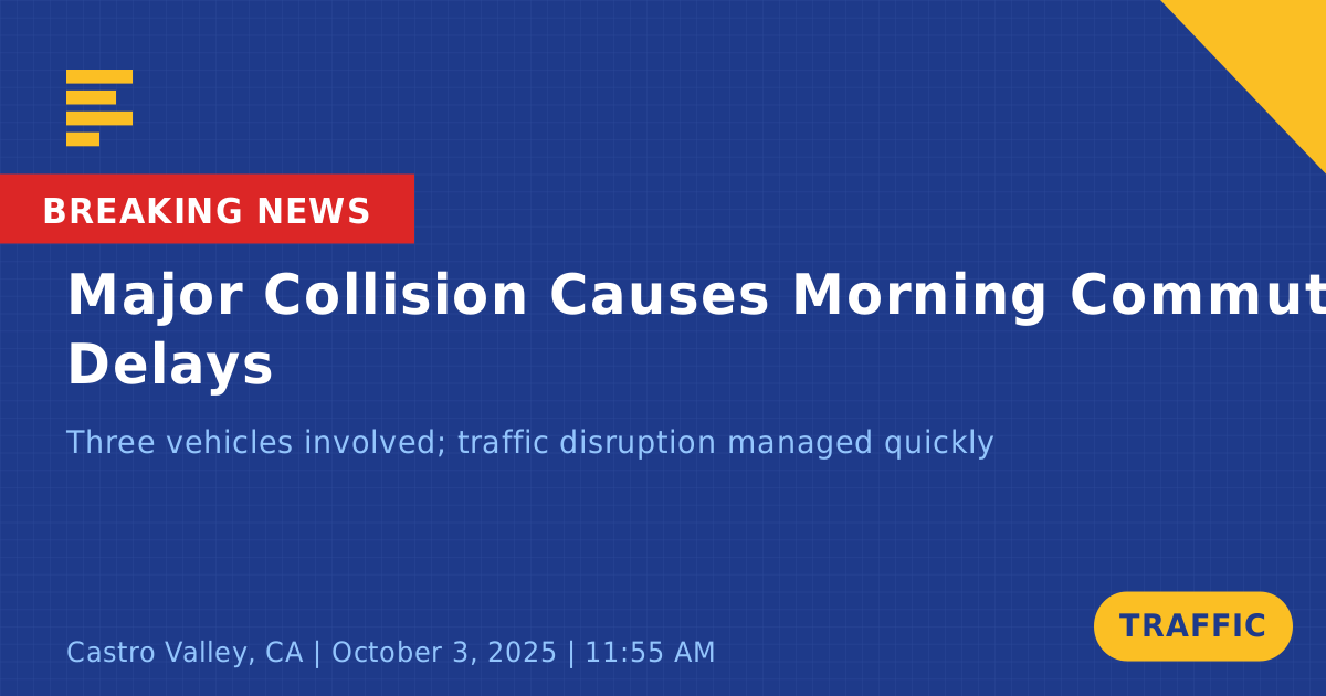 A traffic collision on Interstate 580 East in Castro Valley, CA, caused significant traffic disruptions today during the morning commute. The incident occurred around 11:56 AM and involved three vehicles: a dark grey Honda, a white truck, likely a semi-truck, and an unknown vehicle.