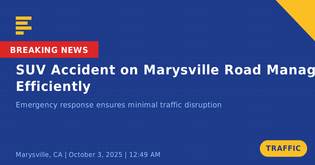 A traffic collision on Scott Grant Road in Marysville, CA, involved one vehicle, an SUV, which left the roadway and came to rest approximately 40 feet down an embankment. The incident occurred early this morning around 12:49 AM, prompting a swift response from emergency units focused on traffic control and scene management.