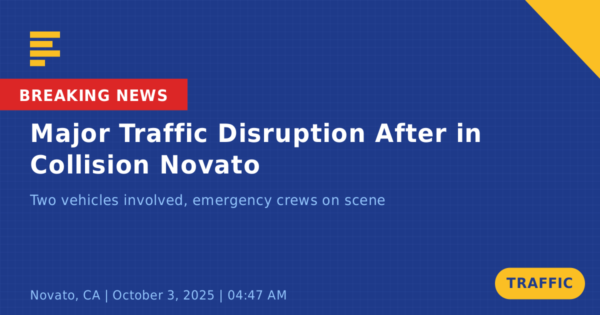 A traffic collision occurred today at the intersection of State Route 37 West and U.S. Highway 101 South in Novato, CA, significantly impacting traffic flow during the morning commute. The incident involved two vehicles: a grey sedan that overturned and blocked the westbound lane, and a blue Honda Civic hatchback that sustained damage from contact with a water barrier.
