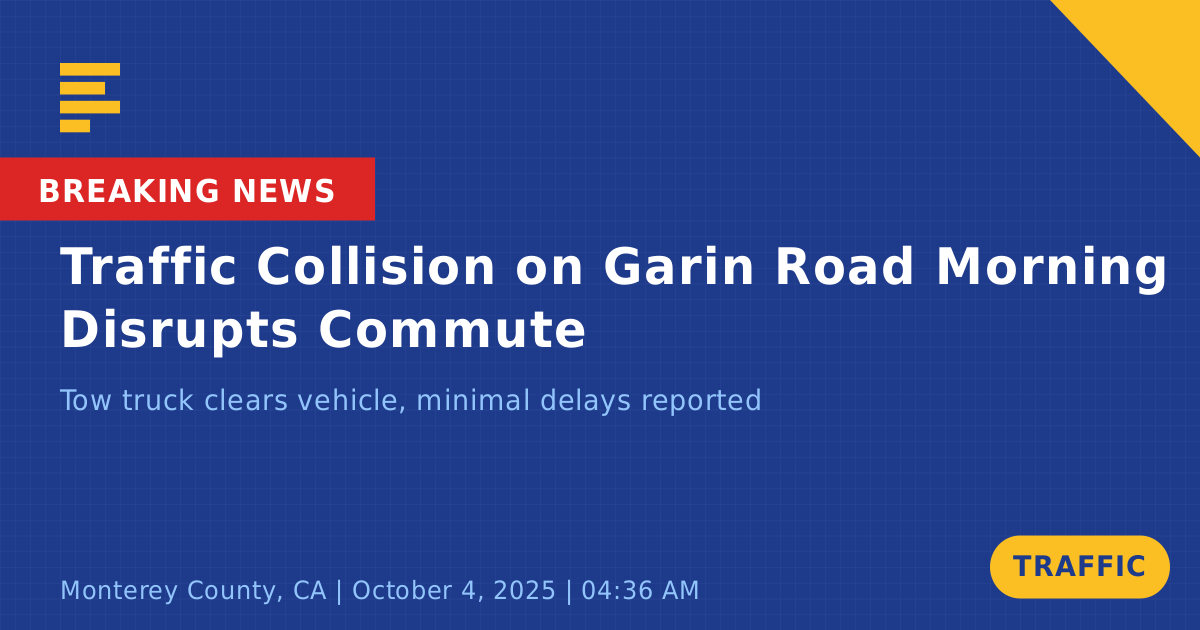 A traffic collision occurred today at the sharp turn of Garin Road and Elkhorn Road in Monterey County, CA. The incident involved one grey vehicle that struck a tree and became wedged between trees, requiring the assistance of a tow truck for removal.