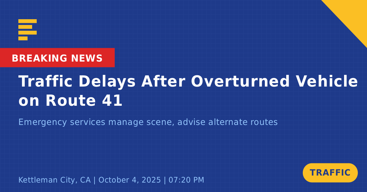 Emergency services quickly responded to the scene to manage traffic and ensure safety for all motorists. As a result of the collision, lane closures were implemented, leading to delays and backups for drivers traveling along State Route 41. The overturned vehicle was visible from the highway, with its wheels facing westbound and lights still illuminated.