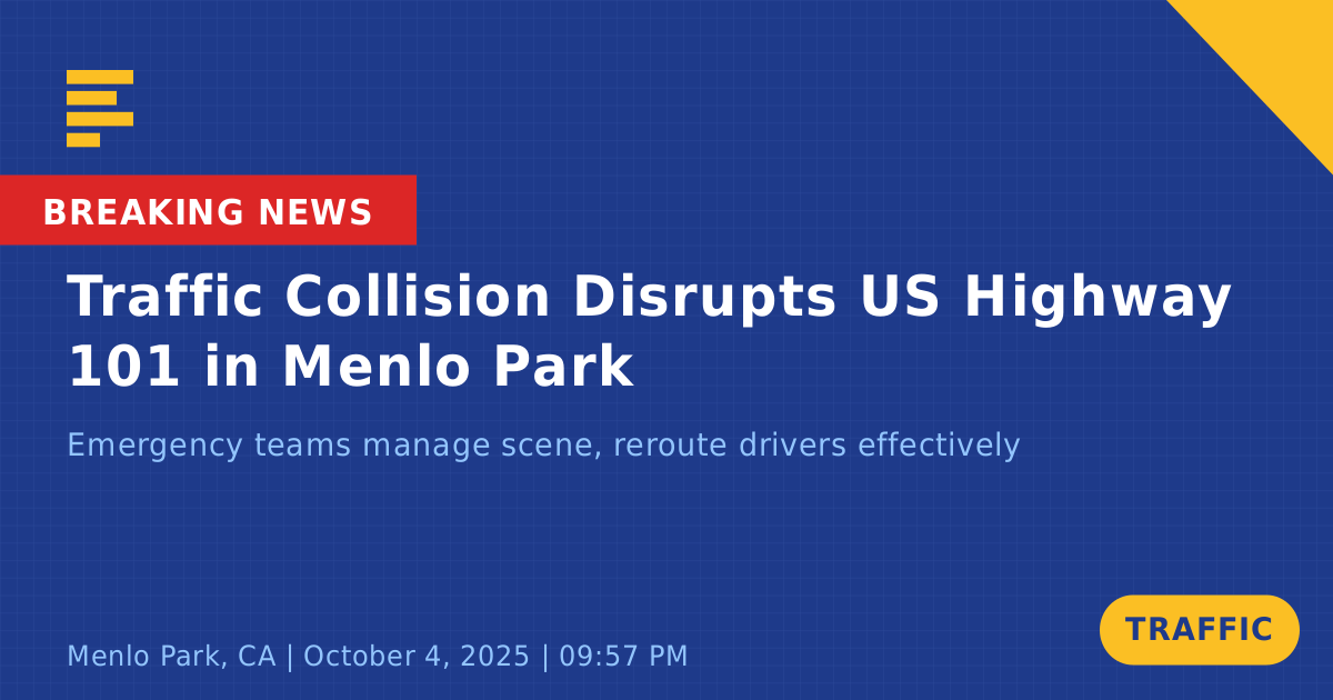 A traffic collision on US Highway 101 South in Menlo Park, CA, caused significant disruptions to traffic flow today. The incident involved two vehicles: a white Toyota and a dark-colored minivan. The collision occurred around 9:58 PM, initially blocking lane 3.