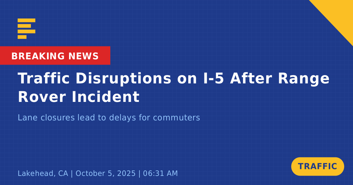 A traffic collision involving one vehicle, a Range Rover, occurred this morning on Interstate 5 North in Lakehead, CA, causing significant disruptions to traffic flow. The incident was reported around 6:33 AM, when the vehicle went off the roadway due to a drop-off in a construction zone, resulting in substantial front and undercarriage damage.