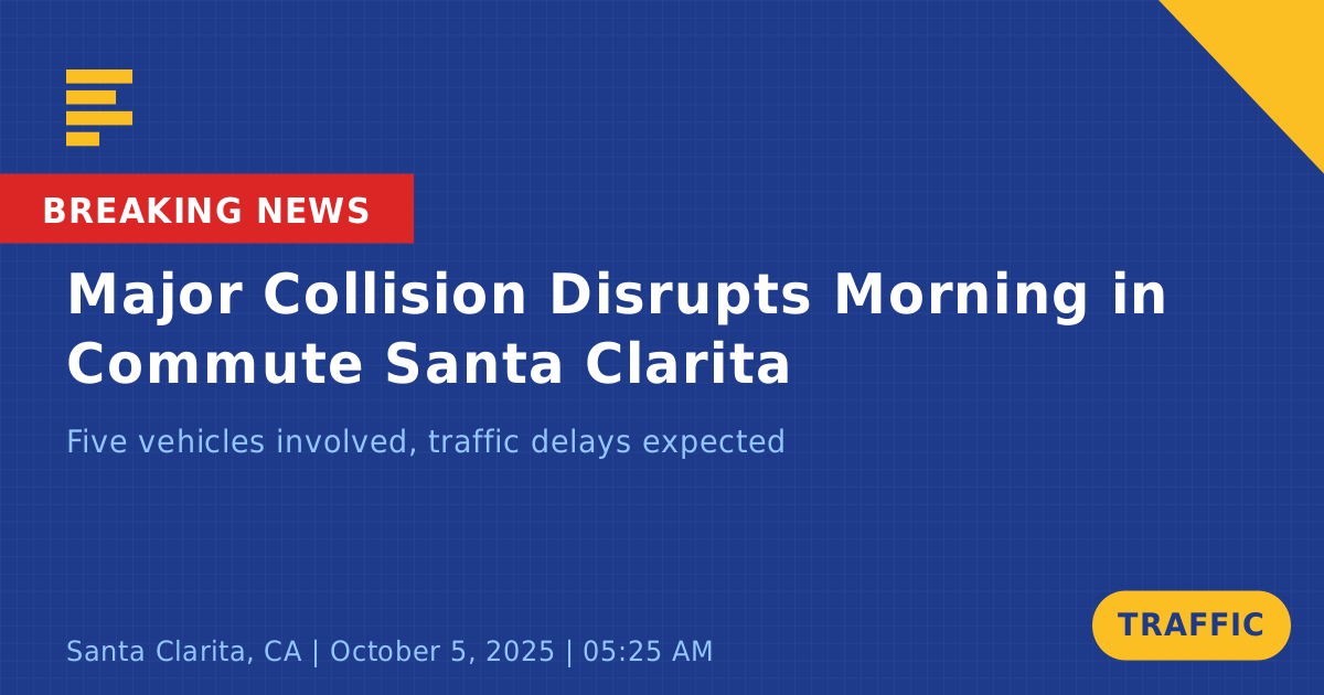 A significant traffic collision occurred today on State Route 14 North at the Newhall Avenue off-ramp in Santa Clarita, CA, causing major disruptions during the morning commute. The incident involved five vehicles, including a semi-truck, a white pickup truck, a dark-colored SUV, and another truck towing a 20-foot open cargo trailer, which was reported to have an overturned dum buggy.