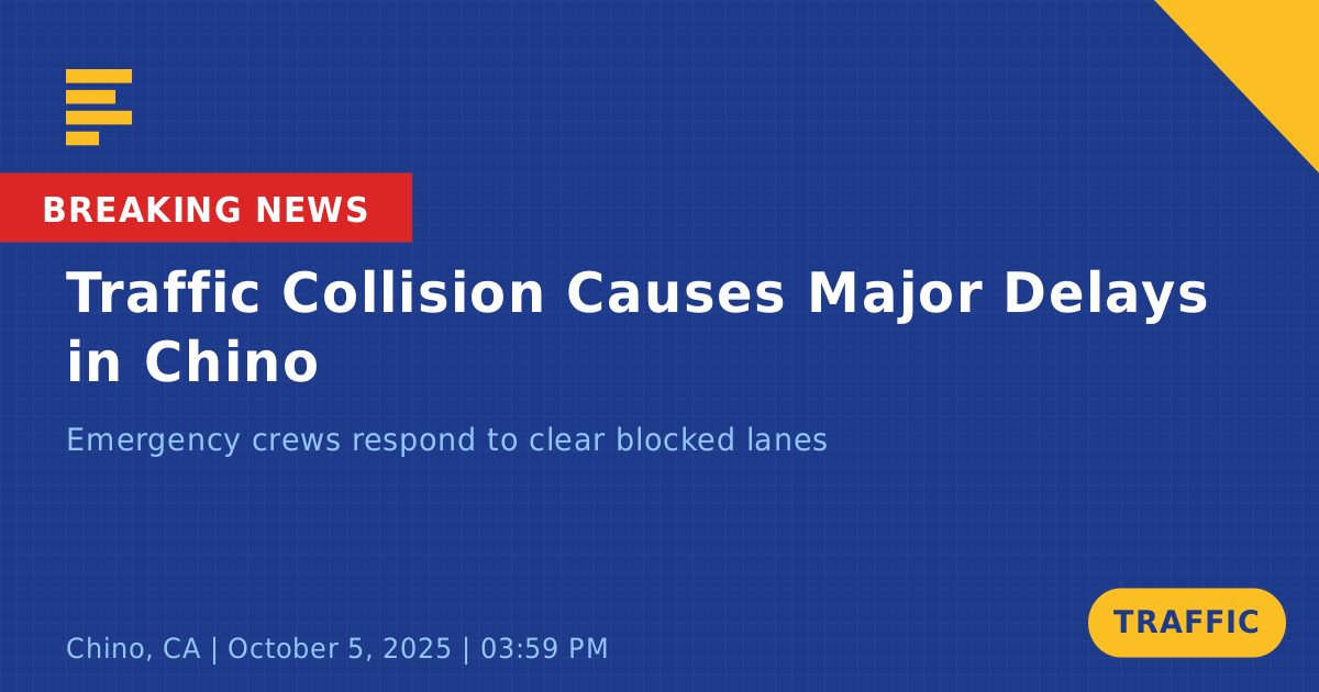 A traffic collision involving two vehicles, a white Tesla and a box truck, occurred today on State Route 60 West at the Mountain Avenue off-ramp in Chino, CA. The incident took place around 4:00 PM and resulted in significant traffic disruption as the Tesla was partially blocking the slow lane while remaining driveable.