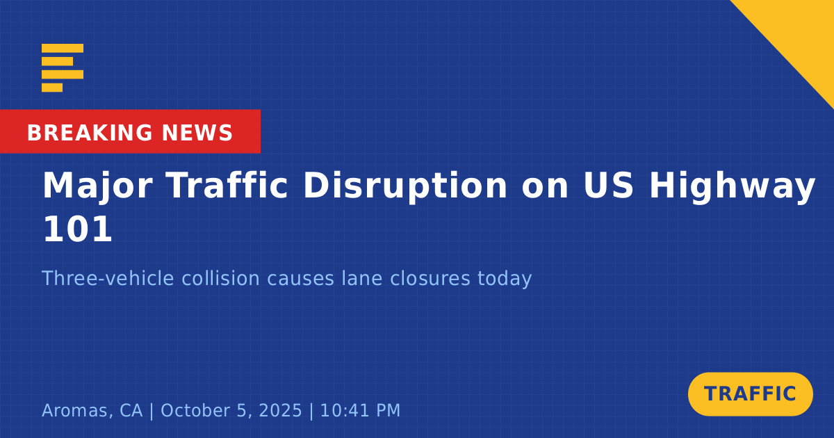 A traffic collision on US Highway 101 South in Aromas, CA, has resulted in significant traffic disruptions today. The incident involved three vehicles and occurred during the evening hours, leading to lane closures as emergency responders worked to manage the situation.