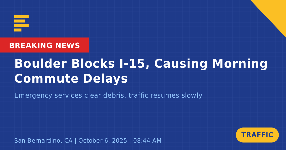 A traffic collision on Interstate 15 (I-15) in San Bernardino, CA, caused notable traffic disruptions during the morning commute today. At approximately 8:46 AM, a red Honda CRV was involved in the incident after hitting a boulder that had fallen onto the roadway. The boulder initially blocked lanes, resulting in delays and congestion for drivers in the area.