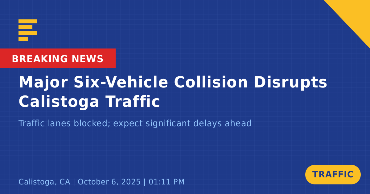 A significant traffic collision occurred today at the intersection of State Route 29 and Tubbs Lane in Calistoga, CA, involving six vehicles. The incident was reported around 1:12 PM and included a grey BMW X3 SUV, a white pickup truck towing a boat, a 2025 Honda Ridgeline, a silver cab semi truck, an unknown pickup truck hauling a white boat, and a blue Ford Fusion.