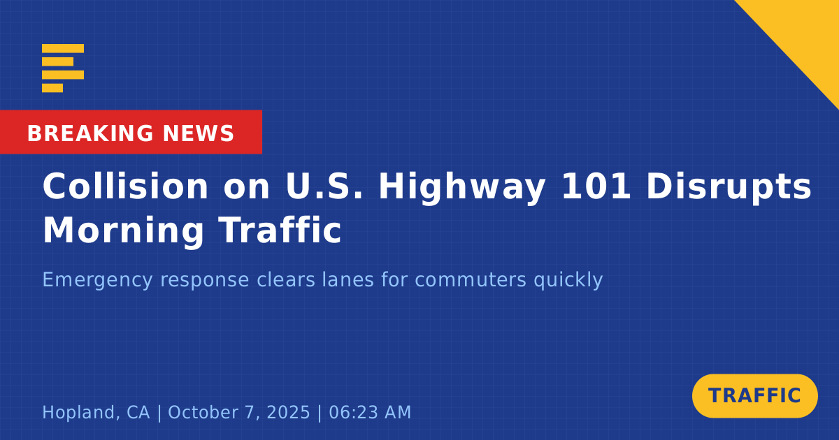 A traffic collision occurred this morning on U.S. Highway 101 in Hopland, CA, involving two vehicles: a dark gray truck and a black Honda. The incident was reported at approximately 6:24 AM, prompting a swift response from emergency personnel to manage the scene and traffic flow.
