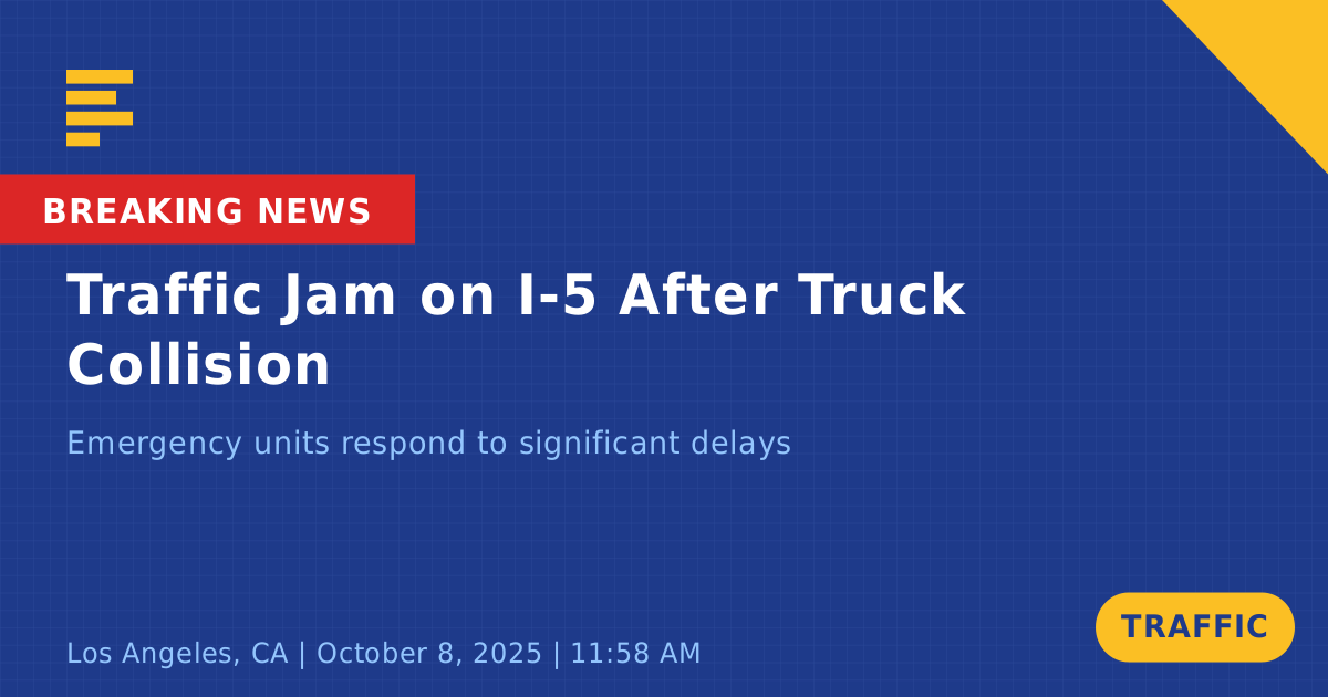 A traffic collision involving a semi truck and a passenger vehicle occurred today at approximately 11:56 AM on the northbound lanes of Interstate 5 (I-5) near the Sunland Boulevard on-ramp in Los Angeles, CA. The incident resulted in the partial blockage of the northbound lanes, causing significant disruptions to traffic flow during the busy morning commute.