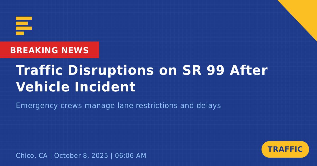 A traffic incident on State Route 99 near Lassen Road in Chico, CA, caused notable traffic disruptions during the morning commute today. At approximately 6:08 AM, a small, dark-colored vehicle went off the roadway, prompting a swift emergency response to manage the situation.