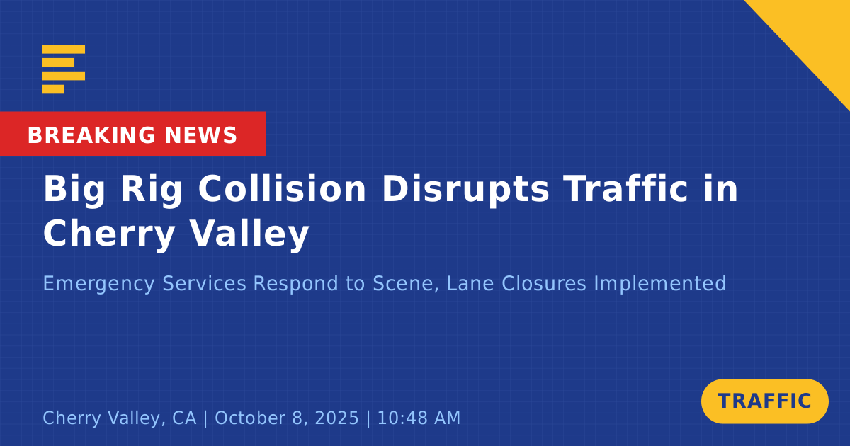 A traffic collision involving a big rig occurred today at 10374 Union Street in Cherry Valley, CA, significantly impacting local traffic. The incident took place around 10:49 AM when the delivery truck struck a power pole, causing damage to the pole. Emergency services quickly responded to the scene to manage the situation and implement traffic control measures.