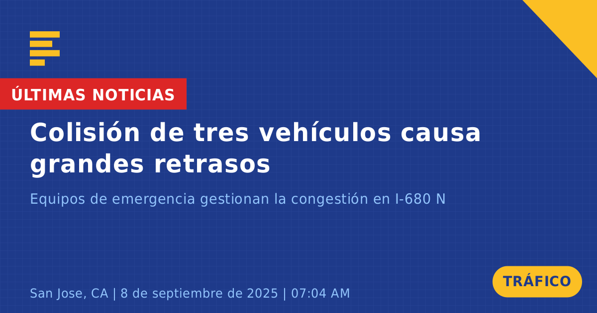 Un accidente de tráfico que involucró a tres vehículos ocurrió hoy en la Autopista 680 Norte (I-680 N) en el Conector de la Autopista 680 Norte y la Ruta Estatal 130 en San José, CA. El incidente tuvo lugar alrededor de las 7:05 AM durante la hora pico de la mañana, lo que resultó en importantes interrupciones del tráfico.
