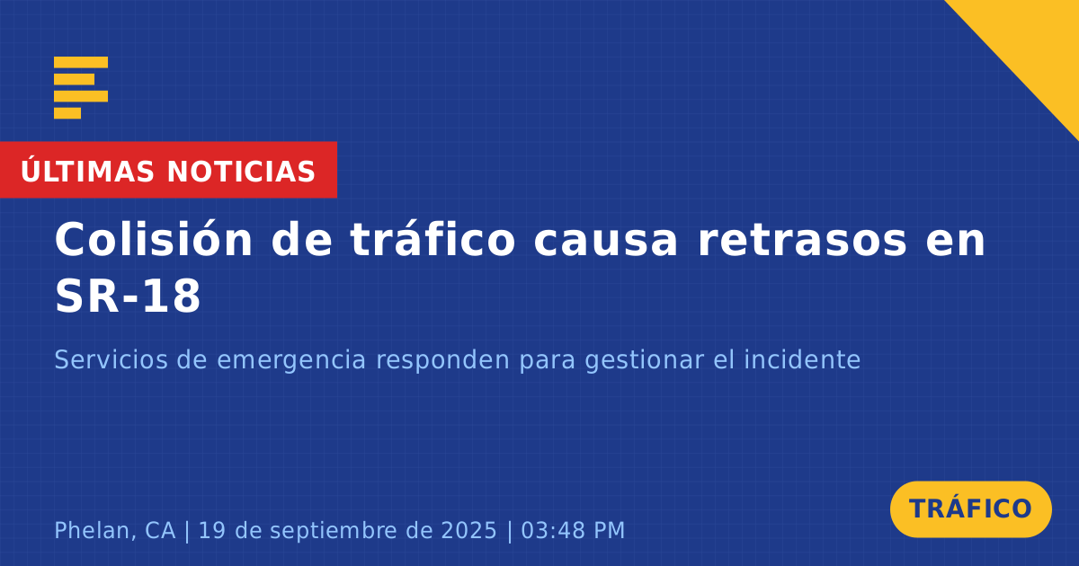 Una colisión de tráfico en la Ruta Estatal 18 (SR-18) en Phelan, CA, causó notables interrupciones en el tráfico hoy. El incidente ocurrió alrededor de las 3:49 PM en la calle Ailanthus, involucrando a dos vehículos. Los servicios de emergencia fueron despachados rápidamente para gestionar la escena y garantizar la seguridad de todos los conductores.