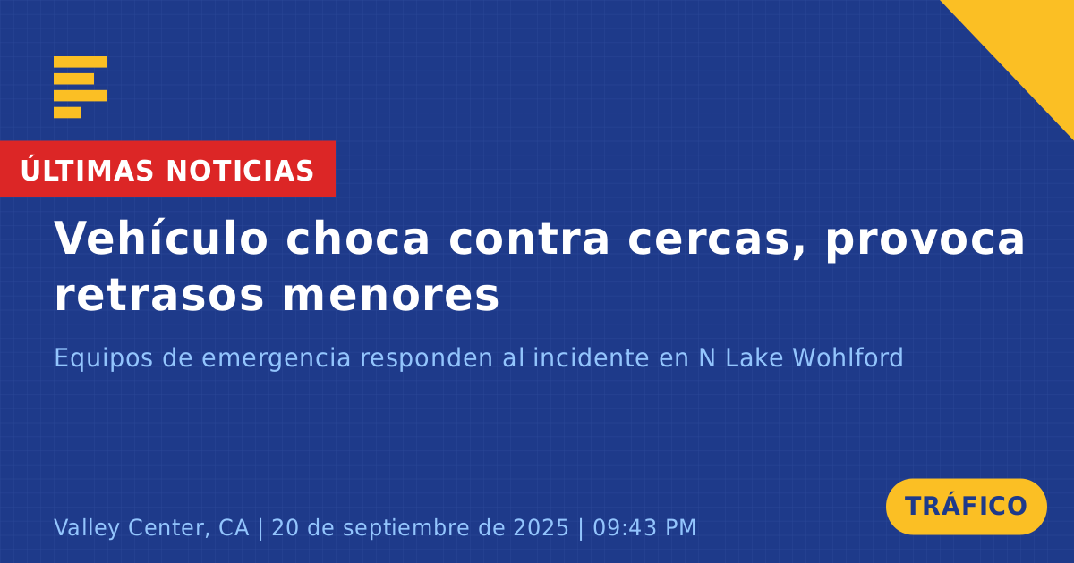 Un accidente de tráfico ocurrió hoy en N Lake Wohlford Road en Valley Center, CA, involucrando un solo vehículo que chocó contra una cerca, causando daños a la propiedad. El incidente fue reportado alrededor de las 9:43 PM, lo que provocó una rápida respuesta de emergencia por parte de las autoridades locales.