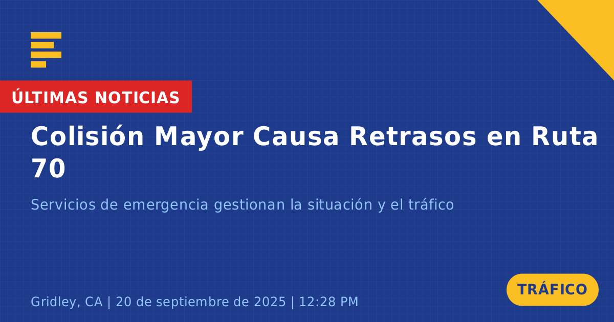 Un accidente de tráfico ocurrió hoy en la Ruta Estatal 70 en Gridley, CA, involucrando a dos vehículos. El incidente fue reportado aproximadamente a las 12:29 PM e involucró a una camioneta Ford F150 dorada con daños significativos en la parte frontal y a una camioneta blanca estacionada más antigua. Ambos vehículos fueron considerados no manejables y se espera que sean remolcados del lugar.