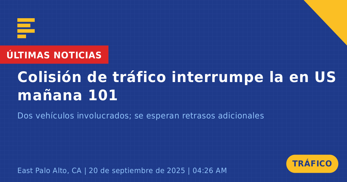 Un accidente de tráfico que involucró a dos vehículos ocurrió hoy en la Autopista 101 Sur de EE. UU., cerca de la salida de University Avenue en East Palo Alto, CA. El incidente fue reportado aproximadamente a las 4:31 AM, causando interrupciones significativas en el tráfico durante la hora pico de la mañana. Los vehículos involucrados fueron un Honda CRV azul y un Honda Civic blanco, ambos con daños moderados.