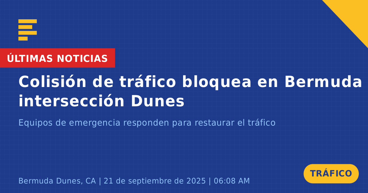 Un accidente de tráfico ocurrió esta mañana en la intersección de Washington Street y Country Club Drive en Bermuda Dunes, CA, involucrando a dos vehículos: una camioneta Ram gris y un vehículo "ONG SD". El incidente fue reportado alrededor de las 6:09 AM y resultó en el bloqueo de la intersección, impactando significativamente el flujo de tráfico.