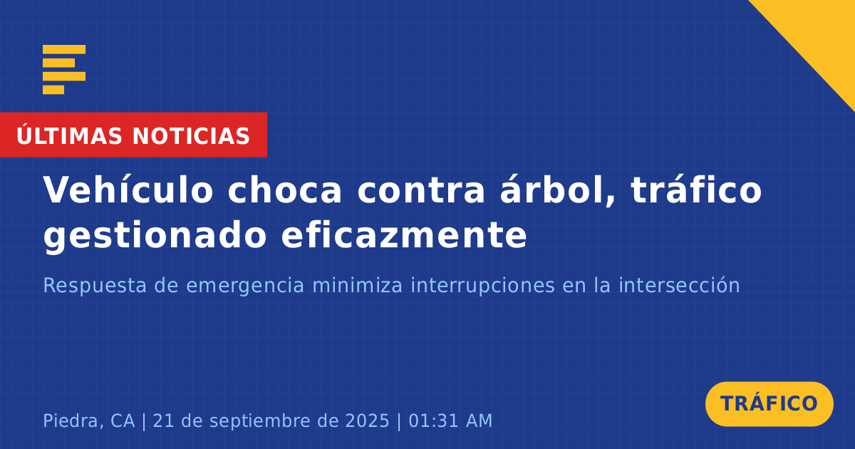 Un accidente de tráfico ocurrió hoy en la intersección de Pine Flat Road y East Trimmer Springs Road en Piedra, CA, involucrando un vehículo que chocó contra un árbol. El incidente fue reportado aproximadamente a la 1:31 AM, lo que llevó a una respuesta inmediata de las unidades de gestión del tráfico para garantizar la seguridad y minimizar la interrupción.