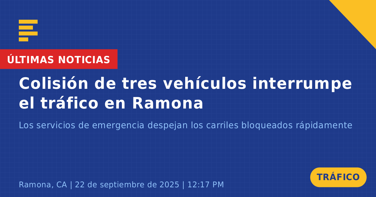 Un choque de tráfico que involucró a tres vehículos ocurrió hoy en la intersección de la Calle 7 y la Calle Principal en Ramona, CA. El incidente tuvo lugar alrededor de las 12:17 PM e involucró a una camioneta GMC blanca, otro camión y una motocicleta. Se informó que la motocicleta quedó atrapada debajo del camión, lo que resultó en daños significativos.