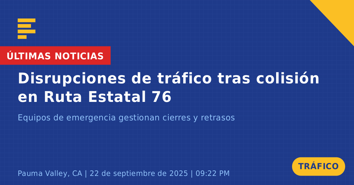 Una colisión de tráfico en la Ruta Estatal 76 en Pauma Valley, CA, ha causado importantes interrupciones hoy. El incidente, que involucró un solo vehículo, ocurrió alrededor de las 9:22 PM cuando el vehículo chocó contra un guardarraíl, lo que resultó en el cierre de carriles y acceso controlado a la carretera.