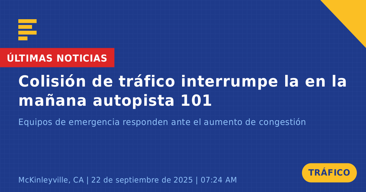 Una colisión de tráfico en la Autopista 101 Sur en McKinleyville, CA, ha causado importantes interrupciones en el flujo de tráfico hoy durante la hora pico de la mañana. El incidente, que involucró un vehículo, ocurrió alrededor de las 7:24 AM cerca de la salida de Murray Road. Los equipos de respuesta de emergencia llegaron rápidamente al lugar para gestionar la situación y controlar el tráfico.
