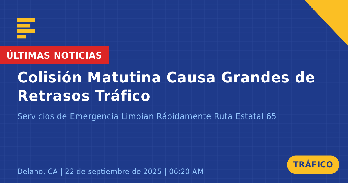 Un choque de tráfico que involucró a dos vehículos ocurrió hoy en la intersección de la Ruta Estatal 65 y la Avenida 2 en Delano, CA. El incidente tuvo lugar durante la hora pico de la mañana, aproximadamente a las 6:21 AM, e involucró a un sedán Hyundai gris y a un sedán Toyota verde. El Toyota sufrió daños significativos y requirió una grúa para ser retirado de la escena.