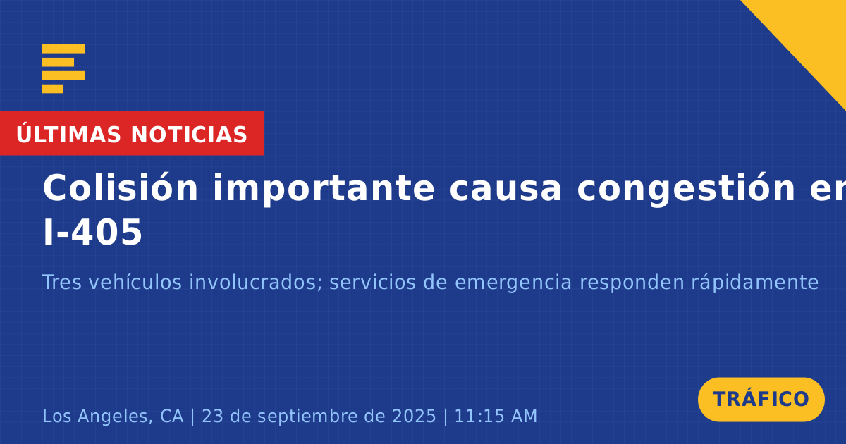 Un accidente de tráfico que involucró a tres vehículos ocurrió hoy en la Interestatal 405 Norte, cerca de Howard Hughes Parkway en Los Ángeles, CA. El incidente se reportó aproximadamente a las 11:13 AM e involucró un Dodge Charger blanco, un Honda Accord gris y una camioneta Toyota gris. La camioneta Toyota quedó inmóvil y bloqueó el carril uno, lo que provocó una congestión significativa en la zona.