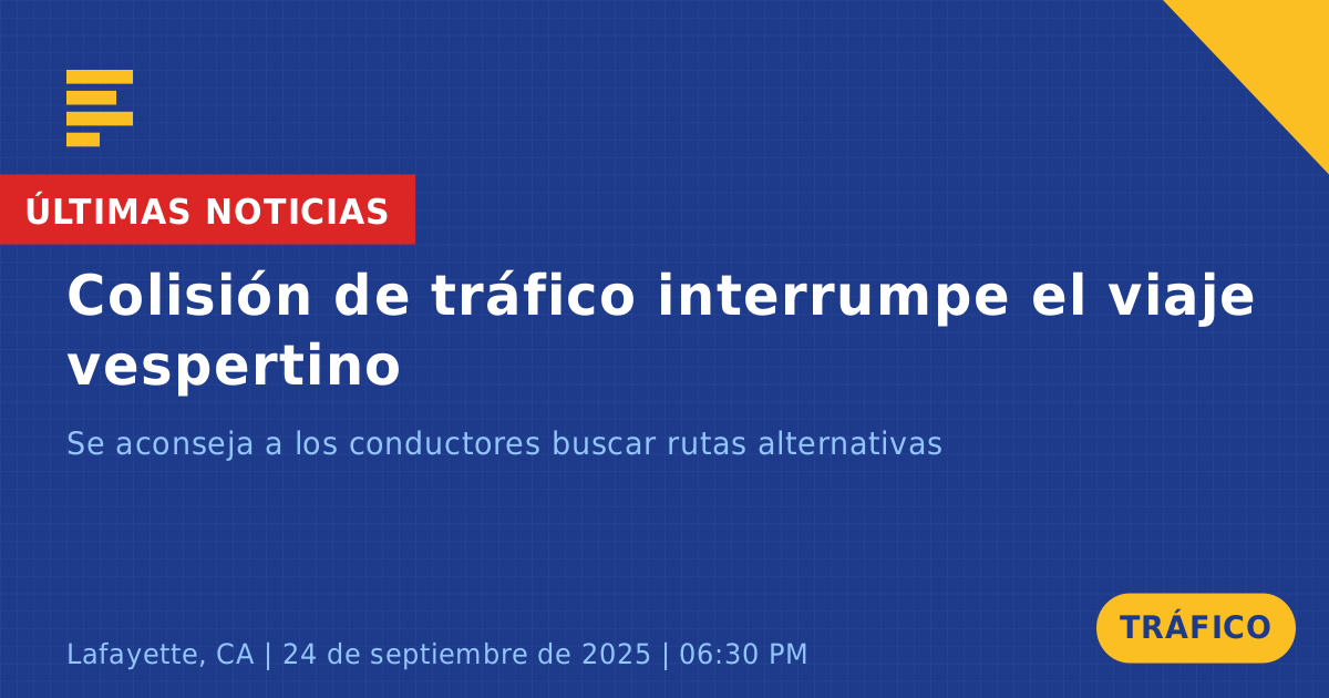 Un accidente de tráfico ocurrió hoy en la intersección de Rancho View Drive y Pleasant Hill Road en Lafayette, CA, causando notables interrupciones en el flujo de tráfico. El incidente tuvo lugar alrededor de las 6:33 PM cuando un vehículo se desvió para evitar un ciervo, lo que resultó en una colisión que involucró a dos vehículos. Ambos vehículos permanecieron en la escena bajo la supervisión de la Patrulla de Carreteras de California (CHP).