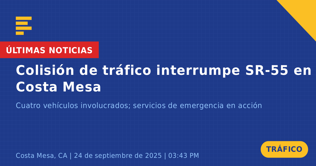 Un choque de tráfico que involucró a cuatro vehículos ocurrió hoy en los carriles hacia el sur de la Ruta Estatal 55 (SR-55) cerca del intercambio con la Interestatal 405 (I-405) en Costa Mesa, CA. El incidente fue reportado aproximadamente a las 2:28 PM, lo que provocó importantes interrupciones en el tráfico en la zona.