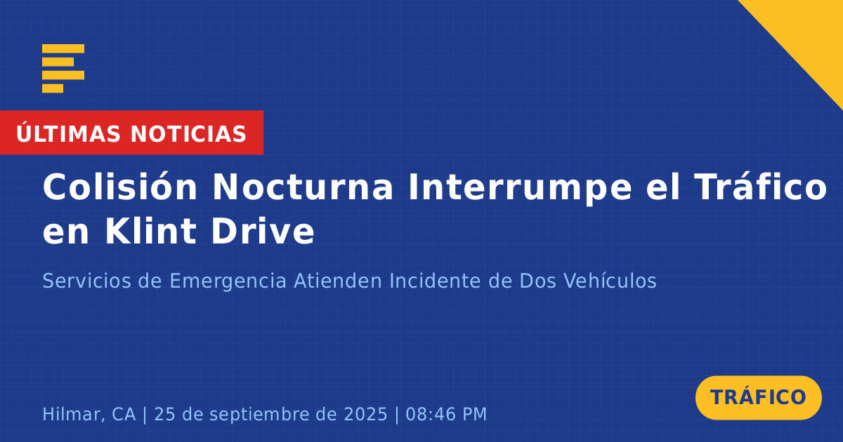 Un accidente de tráfico ocurrió hoy en Klint Drive en Hilmar, CA, involucrando a dos vehículos. El incidente tuvo lugar alrededor de las 8:48 PM cuando un Toyota Camry gris chocó con otro vehículo, que posteriormente abandonó la escena tras impactar una propiedad al costado de la carretera. El Toyota Camry sufrió daños en su lado del pasajero, mientras que la magnitud de los daños en el segundo vehículo no está clara.