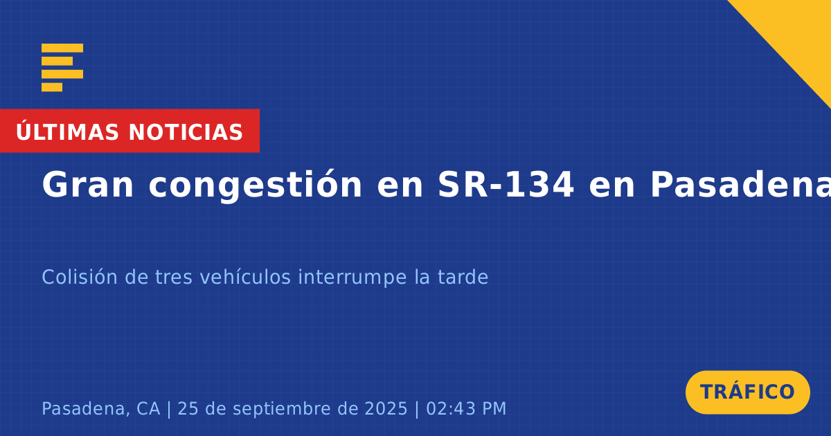 Hoy se registró una colisión de tráfico en los carriles este de la Ruta Estatal 134 (SR-134) cerca de Orange Grove Boulevard en Pasadena, CA. El incidente, reportado aproximadamente a las 2:43 PM, involucró a tres vehículos: un Subaru plateado, un Tesla negro y un vehículo desconocido.