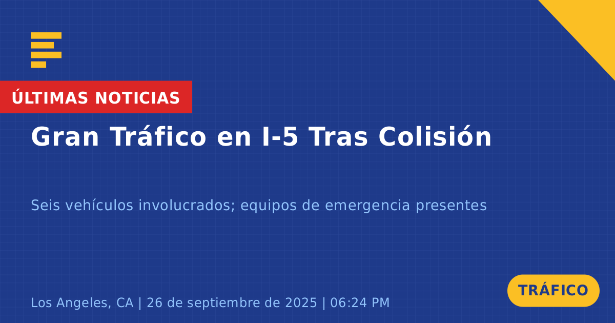 Un accidente de tráfico ocurrió hoy en los carriles hacia el sur de la Interestatal 5 (I-5) en la intersección con la Ruta Estatal 14 en Los Ángeles, CA, causando interrupciones significativas en el flujo de tráfico. El incidente, reportado alrededor de las 6:26 PM, involucró a seis vehículos, incluyendo un Honda azul y un Honda negro, junto con un vehículo que estaba de lado y tres vehículos adicionales en el arcén derecho.