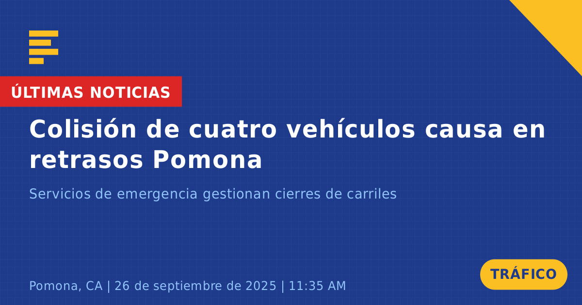 Un accidente de tráfico ocurrió hoy en la transición de la Ruta Estatal 57 Sur a la Interestatal 10 Este en Pomona, CA, involucrando cuatro vehículos: una camioneta Toyota Tacoma gris, un Honda gris, un Honda blanco y un camión negro. El incidente fue reportado alrededor de las 11:37 AM y provocó una respuesta inmediata de los servicios de emergencia.