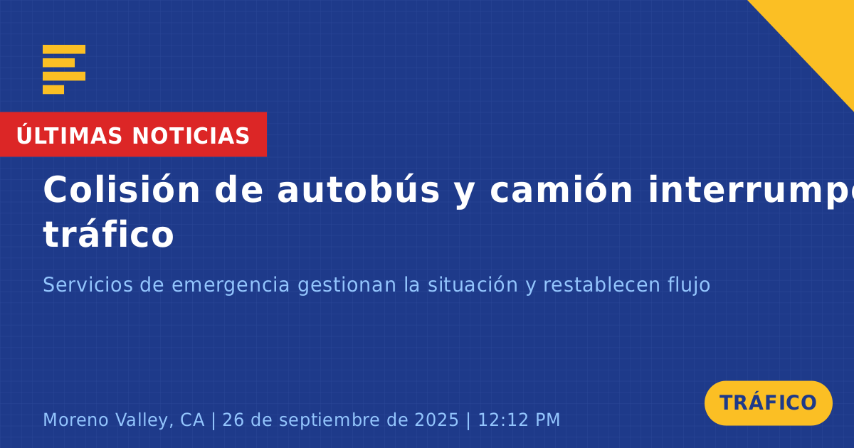 Un accidente de tráfico que involucró un autobús de Riverside Transit y un camión semi SAG ocurrió hoy en la Ruta Estatal 60 Este, cerca de la calle Heacock en Moreno Valley, CA. El incidente fue reportado alrededor de las 12:13 PM, lo que provocó importantes interrupciones en el tráfico durante la hora pico de la tarde.