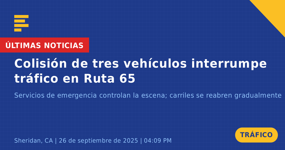 Un accidente de tráfico que involucró a tres vehículos ocurrió hoy en la Ruta Estatal 65 en Sheridan, CA, causando importantes interrupciones en el tráfico durante la hora pico de la tarde. El incidente tuvo lugar alrededor de las 2:55 PM e involucró a un Honda blanco, un camión de caja blanco y un vehículo desconocido. El Honda blanco sufrió daños menores en la parte trasera, pero seguía siendo conducible.