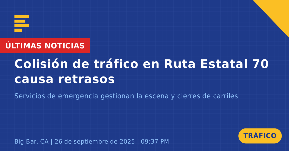 Un accidente de tráfico que involucró a dos vehículos ocurrió hoy en la Ruta Estatal 70 en Big Bar, CA, lo que provocó importantes interrupciones en el tráfico. El incidente fue reportado alrededor de las 9:38 PM, con un vehículo que sufrió daños severos. Los servicios de emergencia respondieron rápidamente a la escena para gestionar el tráfico y garantizar la seguridad.
