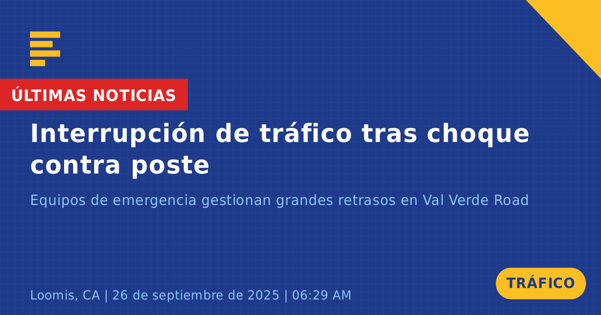 Un accidente de tráfico ocurrió esta mañana en la intersección de Val Verde Road y Horseshoe Bar Road en Loomis, CA, involucrando un solo vehículo, un Acura blanco, que chocó contra un poste de servicios públicos. El incidente fue reportado alrededor de las 6:30 AM y resultó en importantes interrupciones de tráfico, con ambas direcciones de Val Verde Road bloqueadas.
